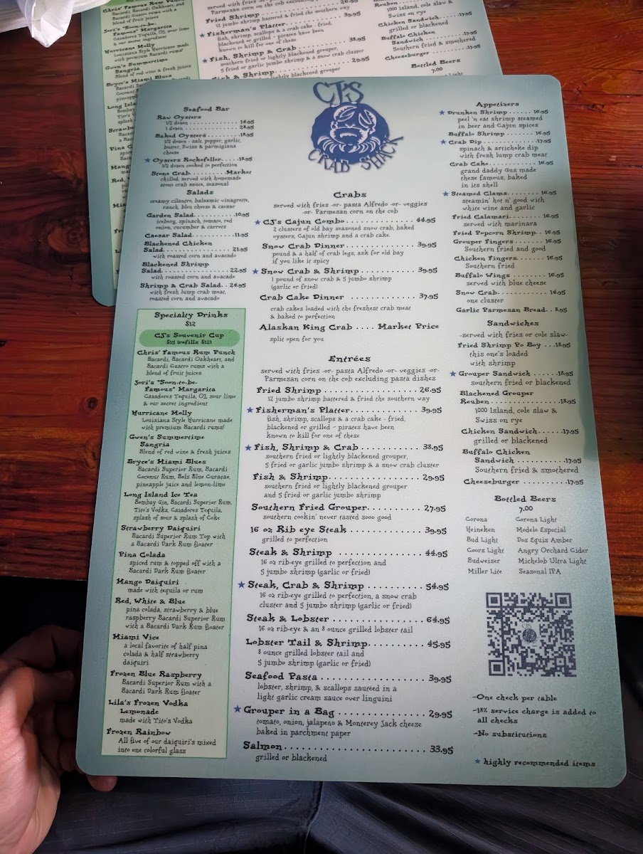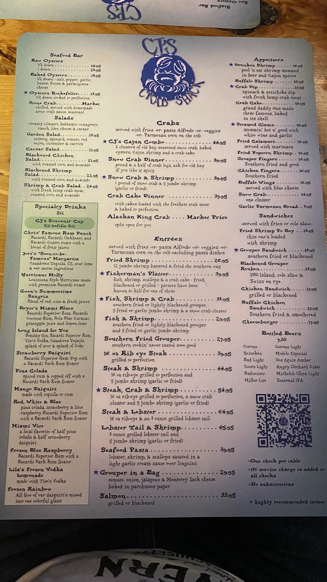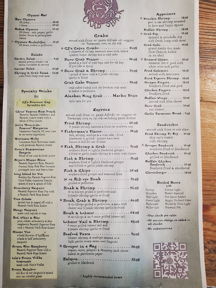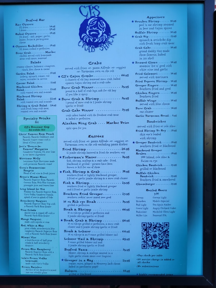 2 clusters of old bay seasoned snow crab, baked oysters, cajun shrimp, and a crab cake.